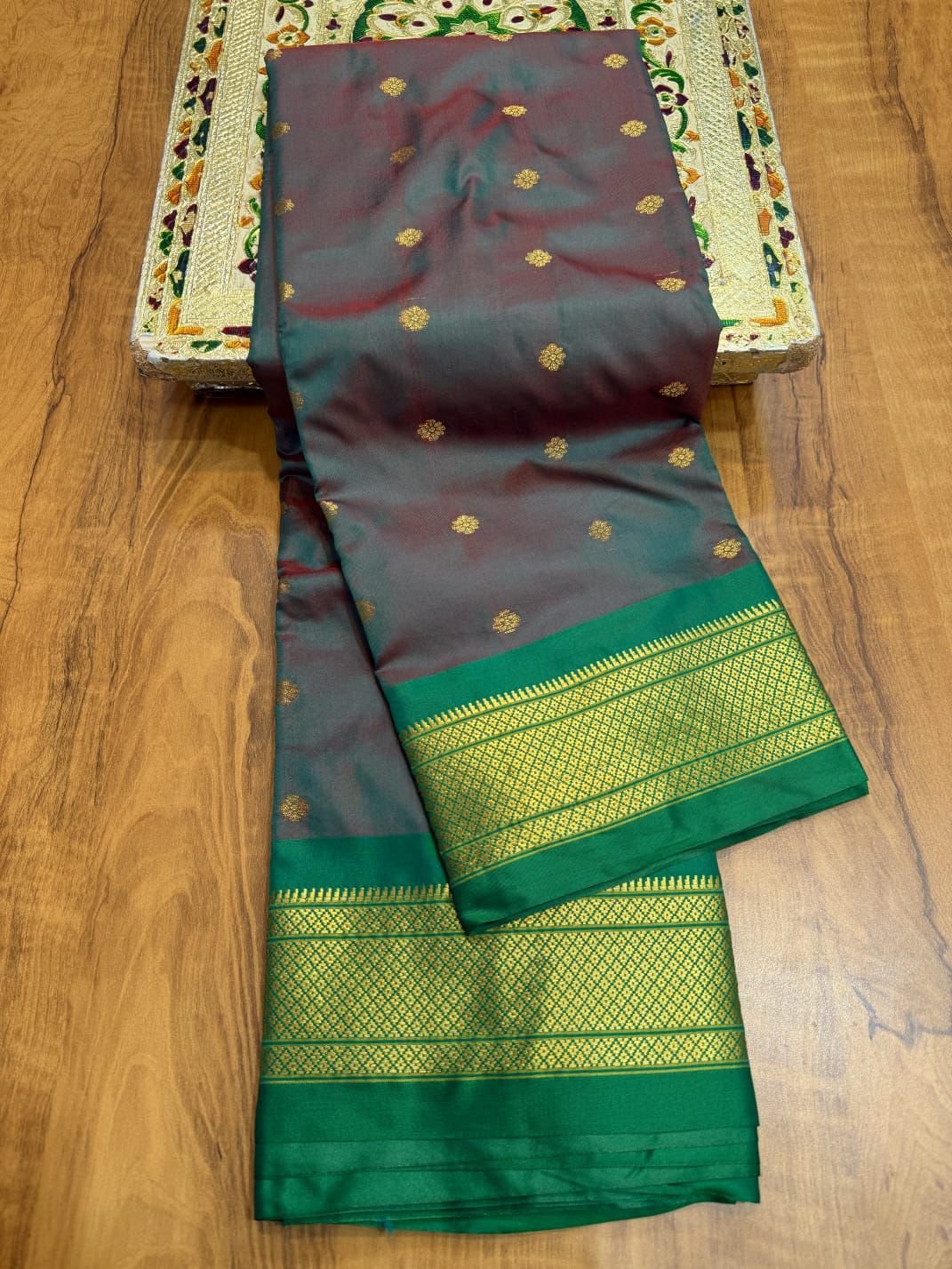 - Color: Elegant Gradient Teal-Green to Deep Maroon / Wine-Red body with Emerald Green-Teal pallu & borders, Golden zari accents, and multi-layered gold-green zari stripes