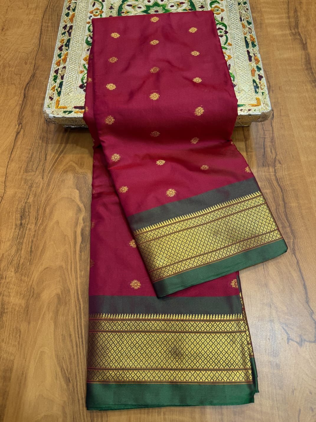 - Color: Rich Maroon / Deep Ruby-Red body with Golden-Yellow pallu & borders, Emerald Green edging, and multi-layered gold-green zari stripes