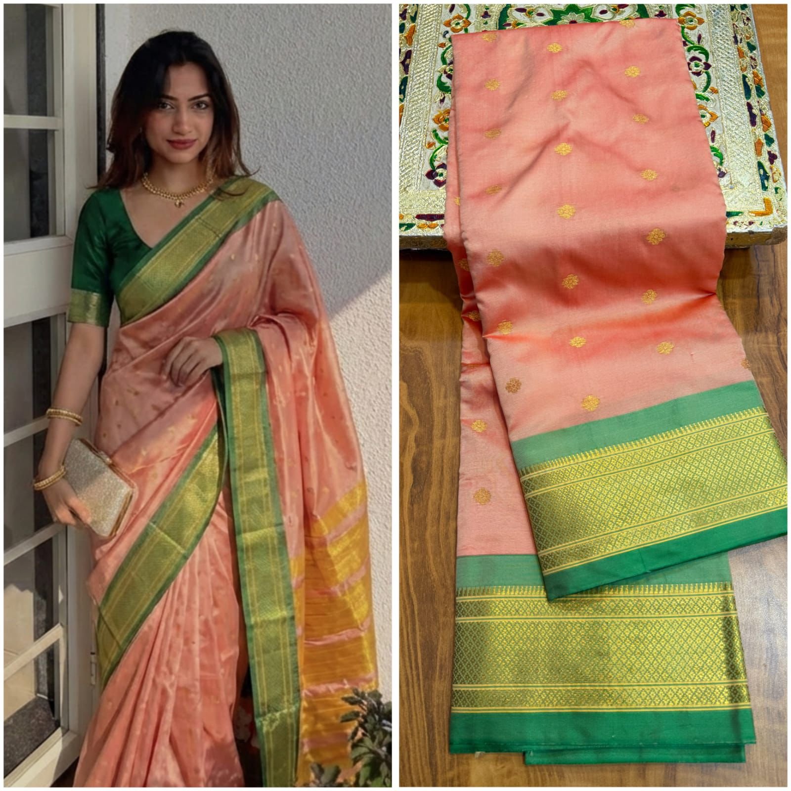 - Color: Soft Peach / Coral-Pink body with Golden-Green pallu, Emerald Green borders, and multi-layered gold-green zari stripes