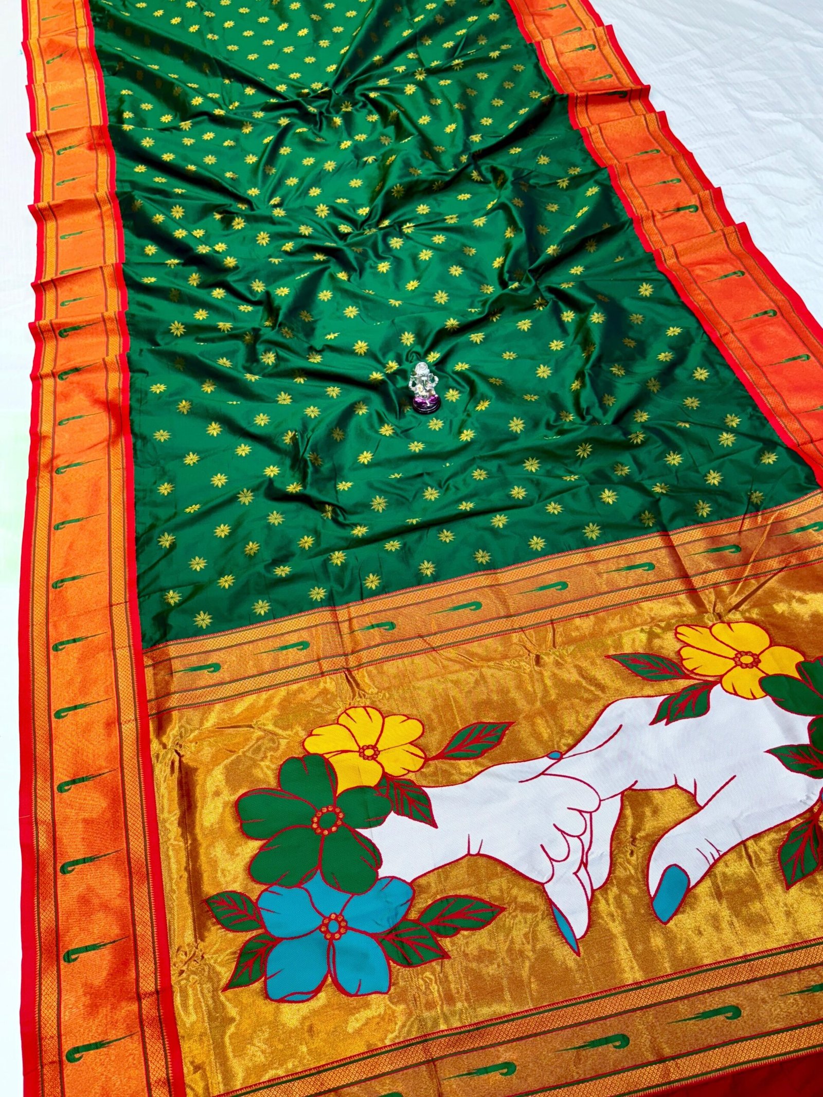 The saree features a vibrant emerald green / forest green body, elegantly scattered with intricate golden zari butti in tiny floral motifs. These shimmering golden dots create a captivating, starry sparkle throughout the fabric, adding subtle radiance and grace with every gentle sway.