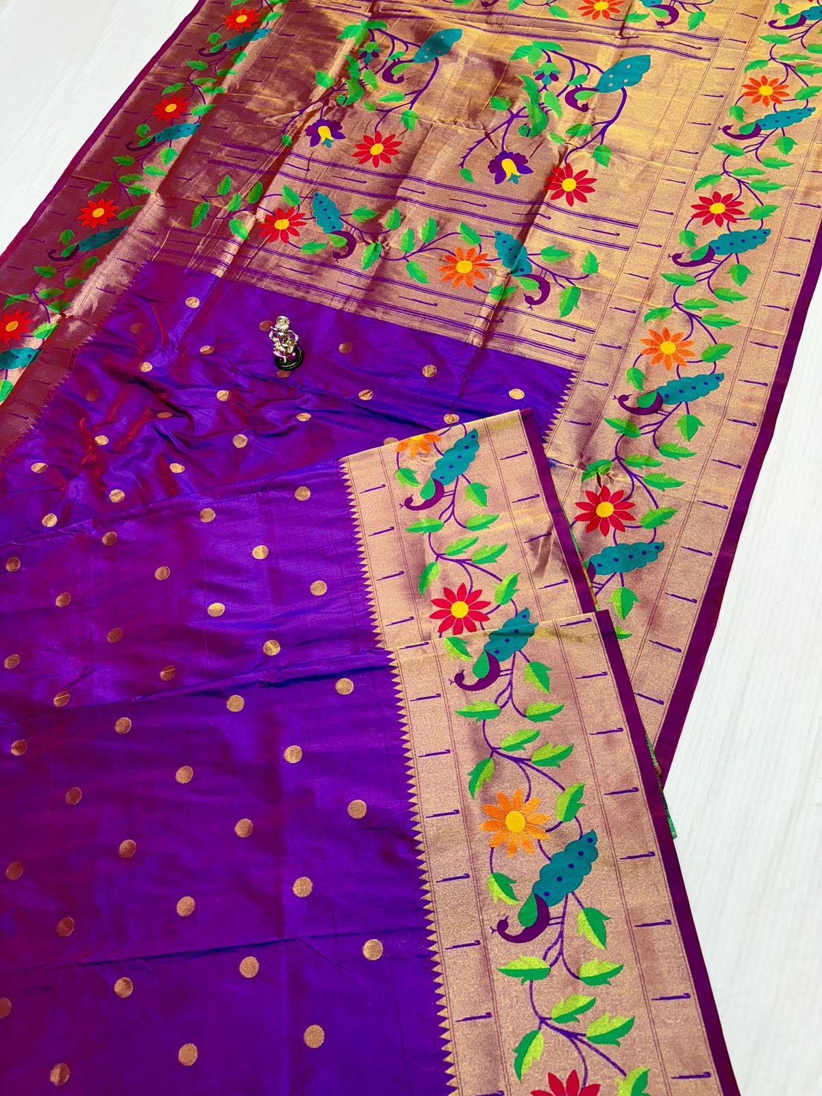 The saree features a majestic deep purple / royal violet body, symbolizing spirituality, royalty, mystery, and elegance. It is gracefully adorned with all-over golden zari butti in delicate, evenly spaced golden dots, creating a subtle, starry shimmer that enhances the fabric’s depth and catches light with every movement.